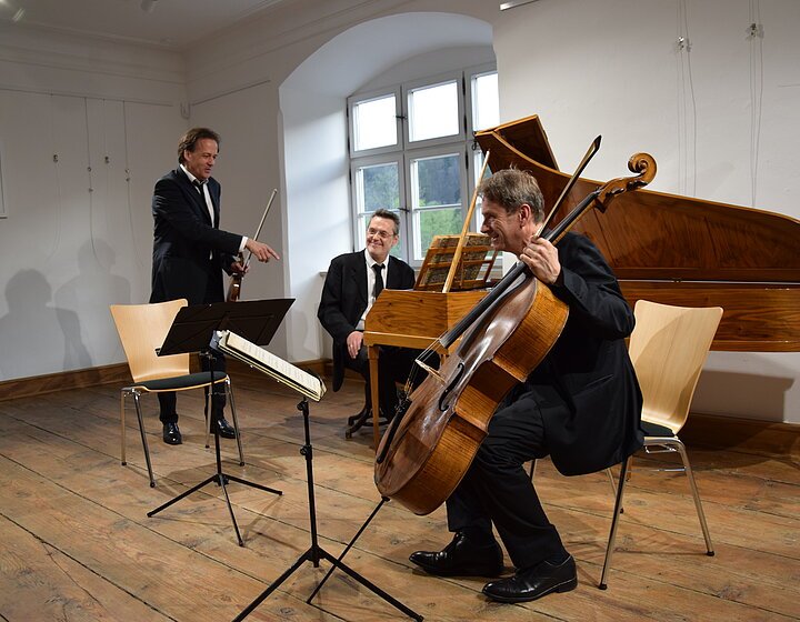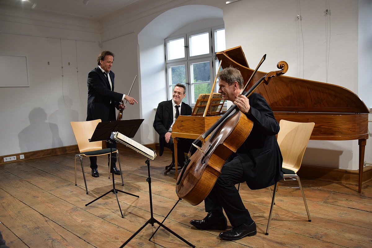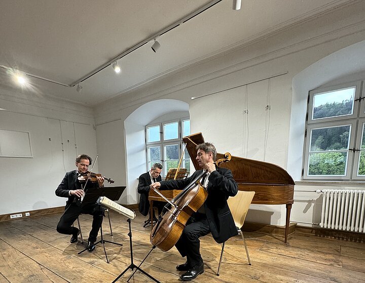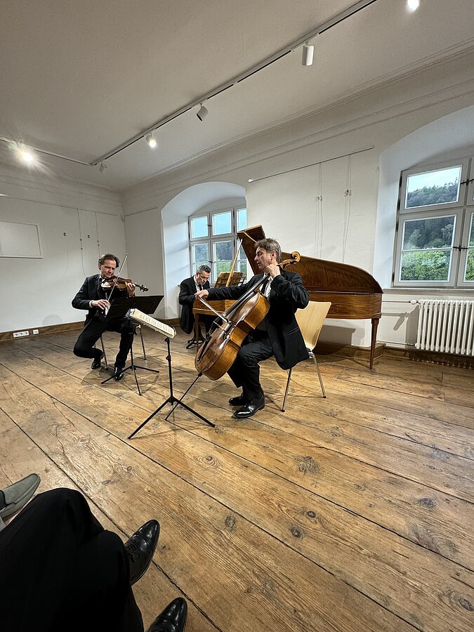 Mit dem klassischen Dreigestirn Haydn-Mozart-Beethoven und als Dreingabe Schubert erhält der ehemalige Pfarrsaal seine musikalische Weihe. Ein Ort der Kultur im Landkreis mit großer Strahlkraft in die Region erlebt sein erstes Konzert. Die Richtung ist vorgegeben, hatte doch Bürgermeister Jörg Nowy ehemalige erste Preisträger des internationalen ARD-Wettbewerbs im Fach Kammermusik eingeladen. Das Haus war voll, die Begeisterung über das Gehörte groß. Mozarts Klaviertrio in B-Dur, KV 502, wahrlich kein Einspielstück, ließ sogleich das hohe Niveau erkennen und war richtungsweisend für den Abend. Drei Musiker verstehen sich, technisch versiert realisieren sie alles auf ihren Instrumenten , was hier Mozart und die noch folgenden Komponisten verlangen. Sie verschmelzen zu einer Einheit in Verschiedenheit: Peter Clemente kostet die Register seines italienischen Meisterinstruments voll aus, ob weitschweifige Melodik, Figuren in schwindelnder Höhe oder massiver Akkordzugriff, alles klingt selbstverständlich, nicht aufgesetzt, die Zuhörer genießen einen lockeren, perlenden Mozart. Konstantin Pfiz, der Cellist, ist der Meister der Kantilene. Ergreifend und mit Hingabe zelebriert er alles , dunkel, geheimnisvoll in der Tiefe, sonorig in der Mittellage und im Sopranregister lieblich präsentiert er den Melodienreichtum, ein Instrumentalist, der alles vom Gesang her angeht und so die Hörer in seinen Bann zieht.. Paul Rivinius legt mit dem Hammerflügel den beiden Streichern den Teppich aus, er ist nicht nur Begleiter, er ist gleichberechtigter Partner und besticht durch seine Technik und musikalische Auffassung dahingehend, dass er die Mechanik seines Instruments überlistet, in dem er durch differenzierteste Anschlagstechnik dem Klaviersatz pulsierendes Leben einhaucht, dynamisch und artikulatorisch.. Zudem versteht es Rivinius, agogisch Spannungsmomente durch Verzögerungen und Beschleunigungen auszukosten. Joseph Haydns „ Zigeunertrio“, Franz Schuberts „Noturno“ und Beethovens „Gassenhauer Trio“ legen Zeugnis von höchster Spielkultur ab. Dieser Beethoven ist in seiner Konstellation, Einfall der Ideen und deren Verarbeitung, gepaart mit zupackender Spielfreude der Interpreten, eine Sternstunde der Kammermusik. Beifall und Jubel! Eine virtuose Kreisler-Zugabe bildet den „Rausschmeißer“.