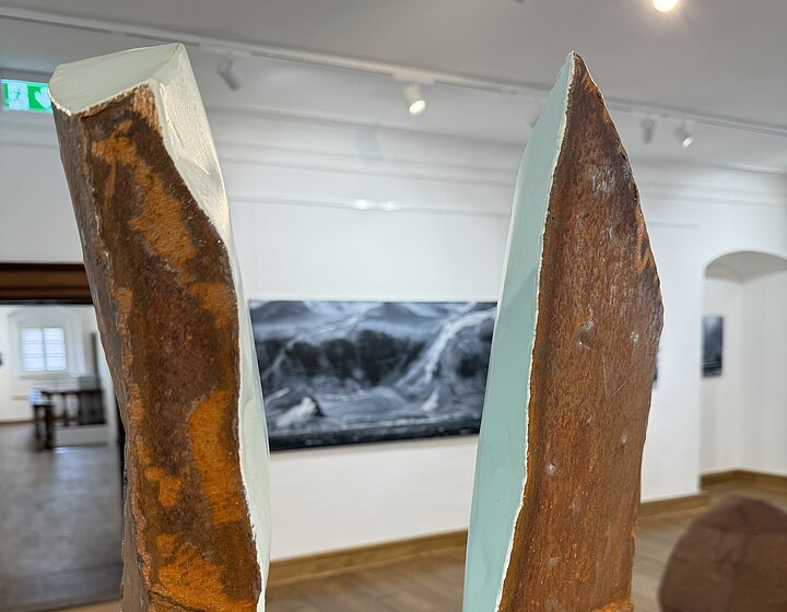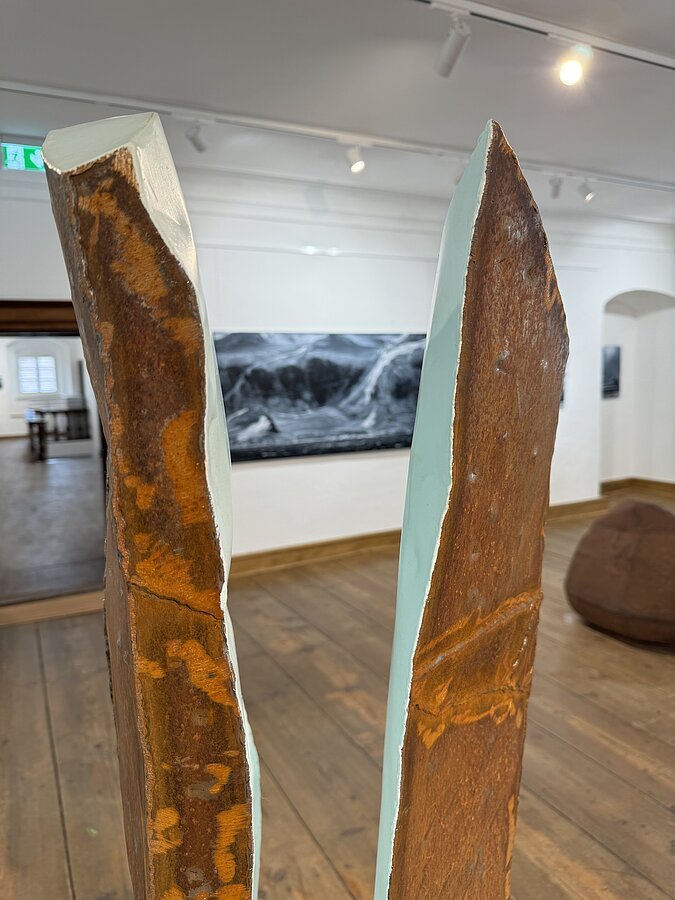 Willi Weiner aus Stuttgart hält in vertikal und horizontal gearbeiteten Skulpturen aus Cortenstahl und Lack Wasserfall und Gletschereis fest und manifestiert das zerrinnende Nass in seiner Kunst. Reizvoll der Kontrast zwischen roter Korrosion und hellem Türkis.