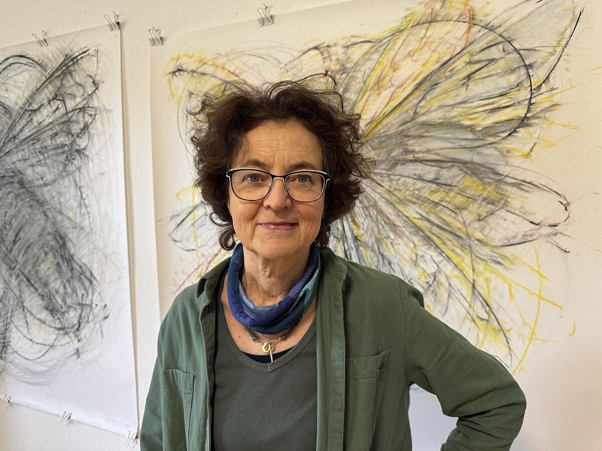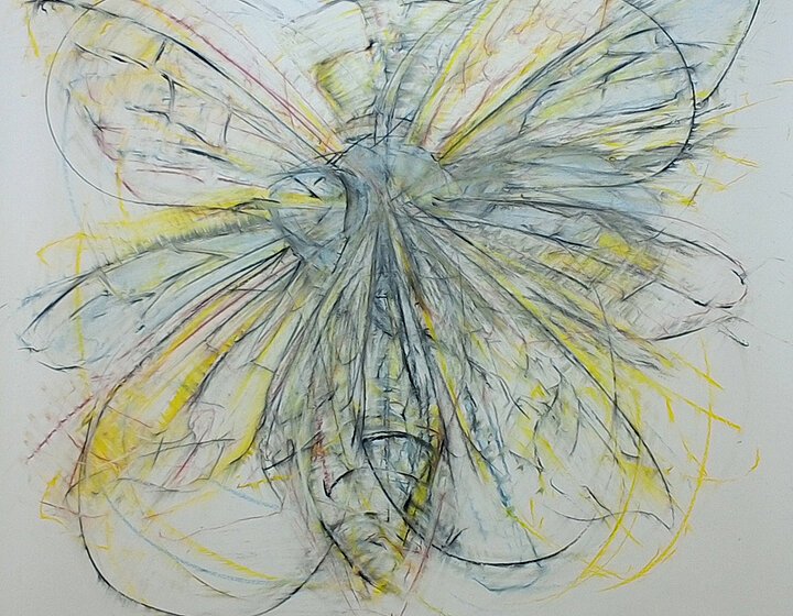 Die Biene steht im Zentrum von Jeanette Zippels Schaffen und mehr als intensiv beschäftigt sich die Künstlerin mit Bewegungsformen und Wabenbau als Ausdruck der sozialen Struktur dieser für Natur und Mensch als Bestäuberinnen und Sammlerinnen so wichtigen Tiere. In den großformatigen Zeichnungen zoomt sie die schnelle Frequenz des Flügelschlags der Immen heran, die plastischen kugelförmigen Objekte frei gestaltet aus Bienenwachs: Optisch und haptisch wie olfaktorisch erlebbar.