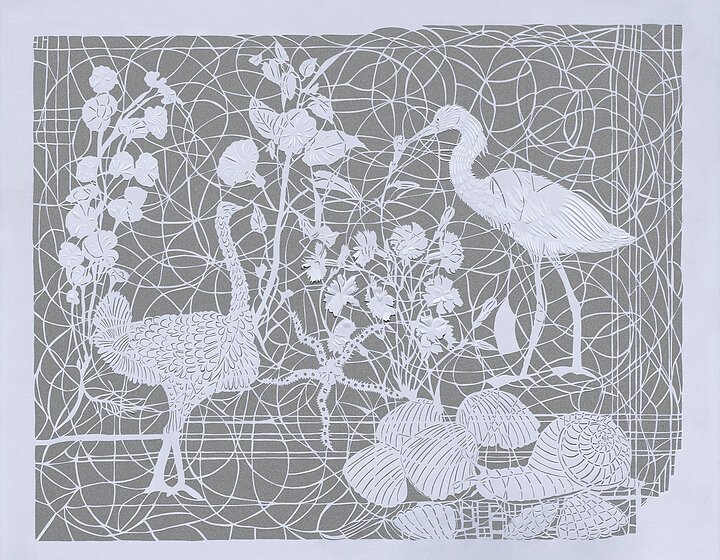 Zipora Rafaelovs diffizile Cutouts entführen in ein hochakkurates Geflecht feiner Linien. Im weißen Papier, dem duftigen Werkstoff, fasst die Künstlerin Tier und Natur als Ornament auf. Dort hebt sie in einigen Partien das Papier vom Untergrund ab und holt die dritte Dimension ihre phantasie- und formenreichen Welt, in der sich stets Neues wahrnehmen lässt.