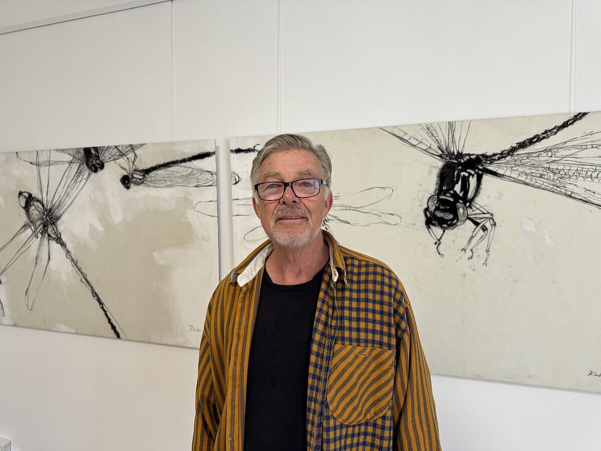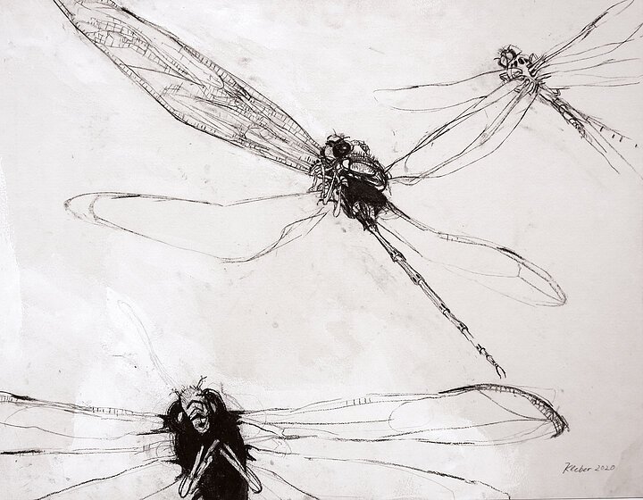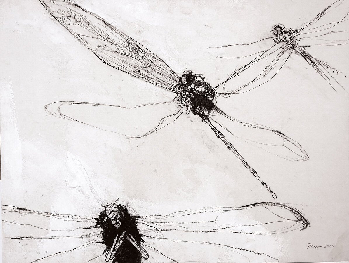Libellen oversized: Sie überfliegen die Werke von Georg Kleber. Die Hautflügler sind ständig in Bewegung und der Künstler zeigt quasi Stills aus dem Lebensfilm dieses faszinierenden Insekts mit schwarzer Acrylfarbe, Kohle und wenig weißen Setzungen auf hellem Filz. Mehr braucht es nicht, um das räuberische Insekt gekonnt zu charakterisieren.