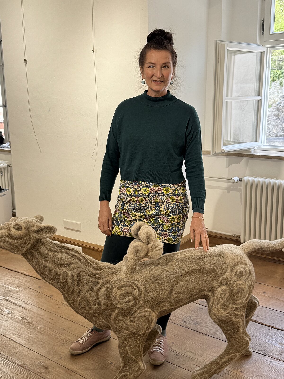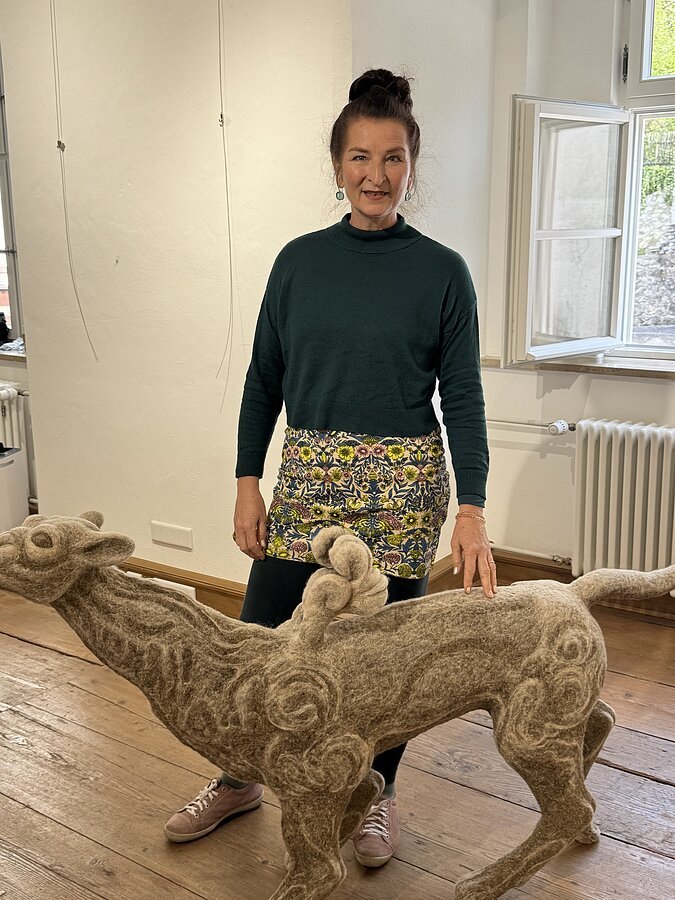 Stefanie Ehrenfried, eine Bildhauerin, die sich durch handgefilzten Objekte einen Namen gemacht hat. Sie verbindet Tierhaare auf einmalige Weise mit ihrem Tun und lässt unter anderem hybride Fabelwesen, ein Januskopf-Motiv sowie einen ausdruckstarken Frauenkörper samt einer animalischen Fratze entstehen – ästhetisch, eigenwillig und irritierend. Die Künstlerin katapultiert den Betrachter in eine erstaunliche Bildwelt.