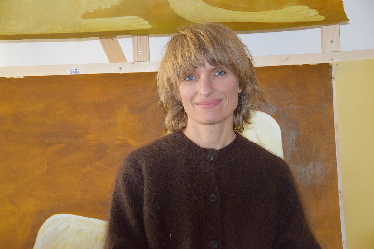 Die großen Formate der österreichischen Künstlerin Lena Göbel verschlingen den Betrachter mit ihrer enigmatischen Präsenz. Sie collagiert Holzschnitte auf in dunklem Kolorit atmosphärisch bemalte Leinwände und arbeitet so über die Grenze von Bildhauerei und Malerei hinweg. Mensch und Tier – hier der Panter – vereinen sich motivisch in diesen Werken, die letztlich tief in der Tradition der Portraitmalerei verwurzelt sind.