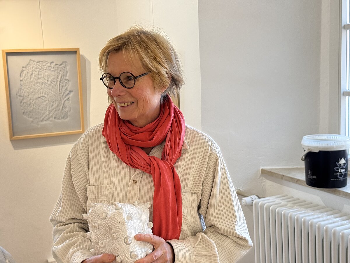 Pfoten, Schnauzen, Fell und Haut, aber auch Krallen und scharfe Zähne haben es ihr angetan: Maria Rucker extrahiert Körperteile verschiedener Tiere und hält sie in Stein fest. Sie erarbeitet spannende Wandstücke und Objekte in geschlossener Form, akkurat und artgerecht auf den Punkt gebracht. Für den Betrachter, wen er mag, schön zu rätseln, was zu welchem Tier gehört. Schön anzusehen sind die Werke allemal.