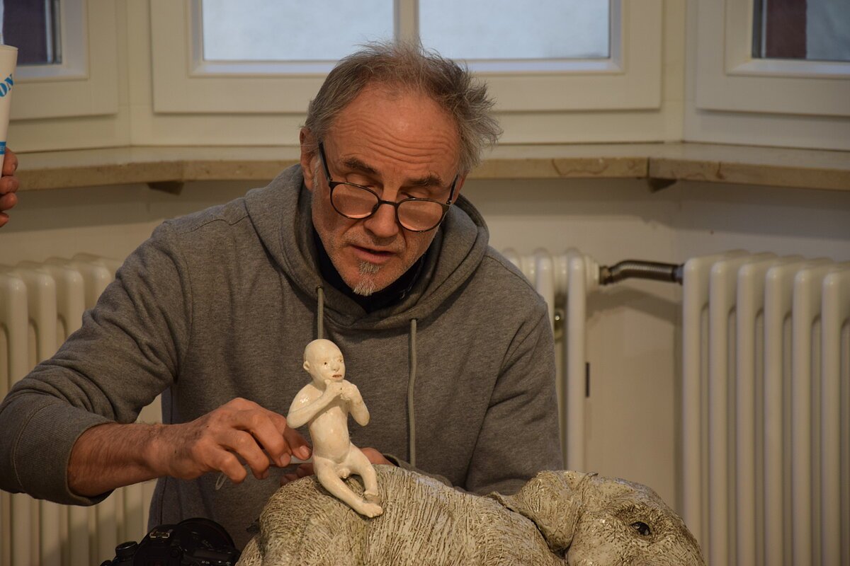 In Lothar Serusets keramischen Plastiken emulgieren Mensch und Tier auf besondere Weise. Symbolhaft und metaphorisch durchdrungen, zeigen die Figurationen eine unabdingbare Abhängigkeit von Tier und Mensch und Mensch und Tier in surrealer Anmutung.