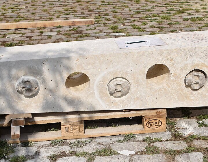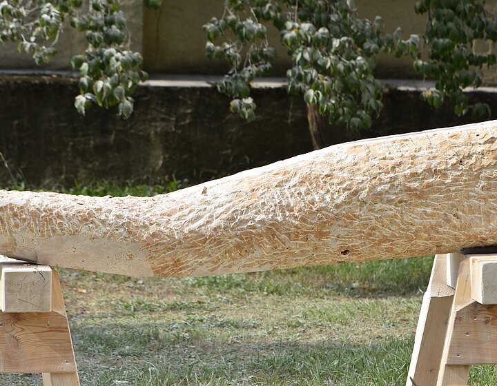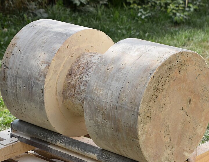 Die Inspiration lag in einer Höhle Nähe Essing. Ein kleines Stück Elfenbein wurde dort gefunden, darauf eingearbeitet eine Ritzzeichnung, die ein Mammut darstellt. Die Begeisterung für dieses Geschöpf war so groß gewesen, dass dieser Urmensch es festhalten musste. Dies wurde bildhauerisch so ausdruckstarken und archaischen umgesetzt, dass mich die Arbeit überzeugte diese Skulptur zu schaffen. Die abgebrochene Fläche der Steinskulptur steht für das Fragment aus Elfenbein, welches man in der Höhle fand. Das Objekt stellt einen stilisierten Stoßzahn da, auf dem meine Interpretation der Ritzzeichnung sich über die Steinfläche zieht. Das Neue entstand aus dem Ursprung, wenn das Alte nicht stattgefunden hätte, würde das JETZT nicht existieren.