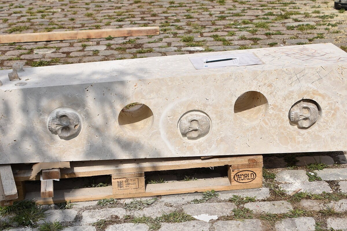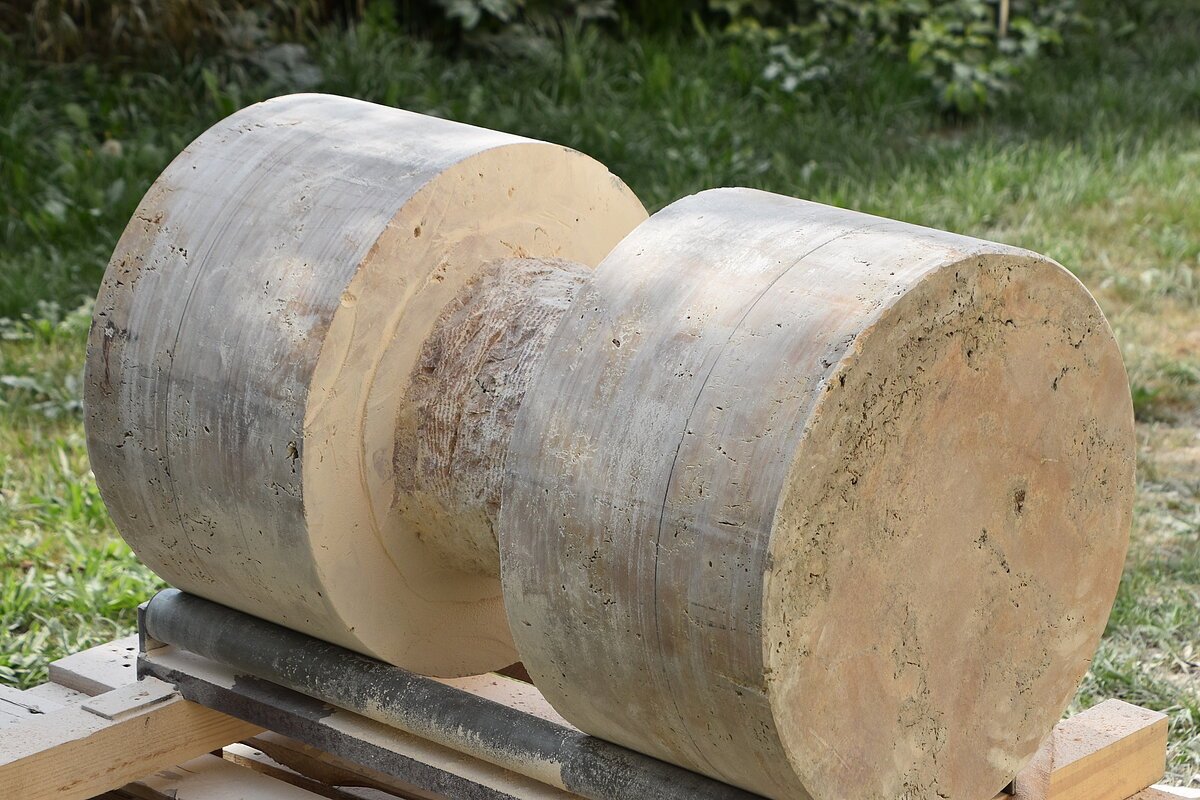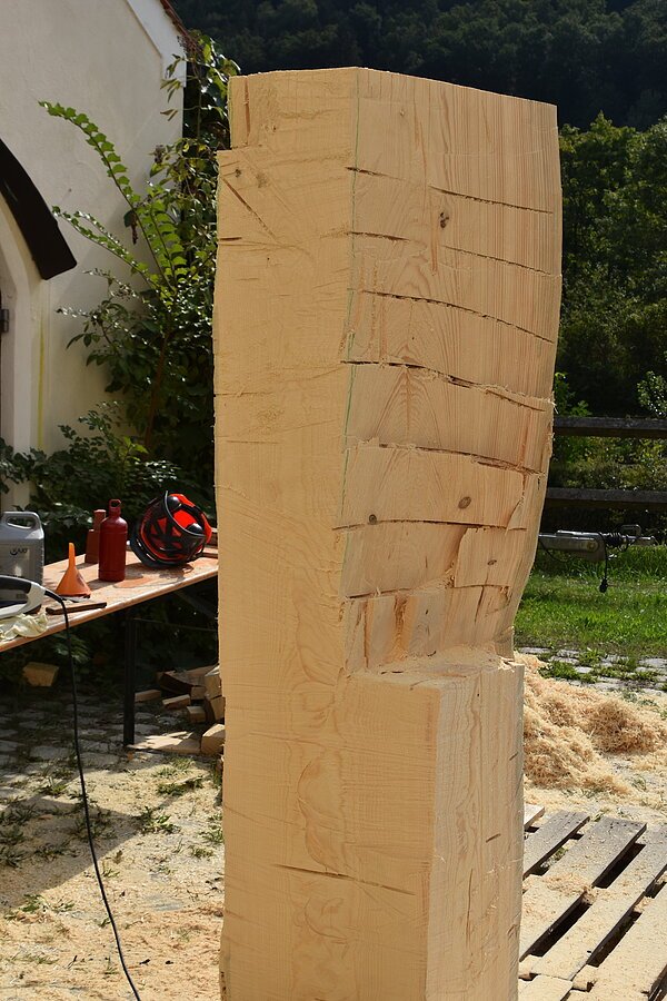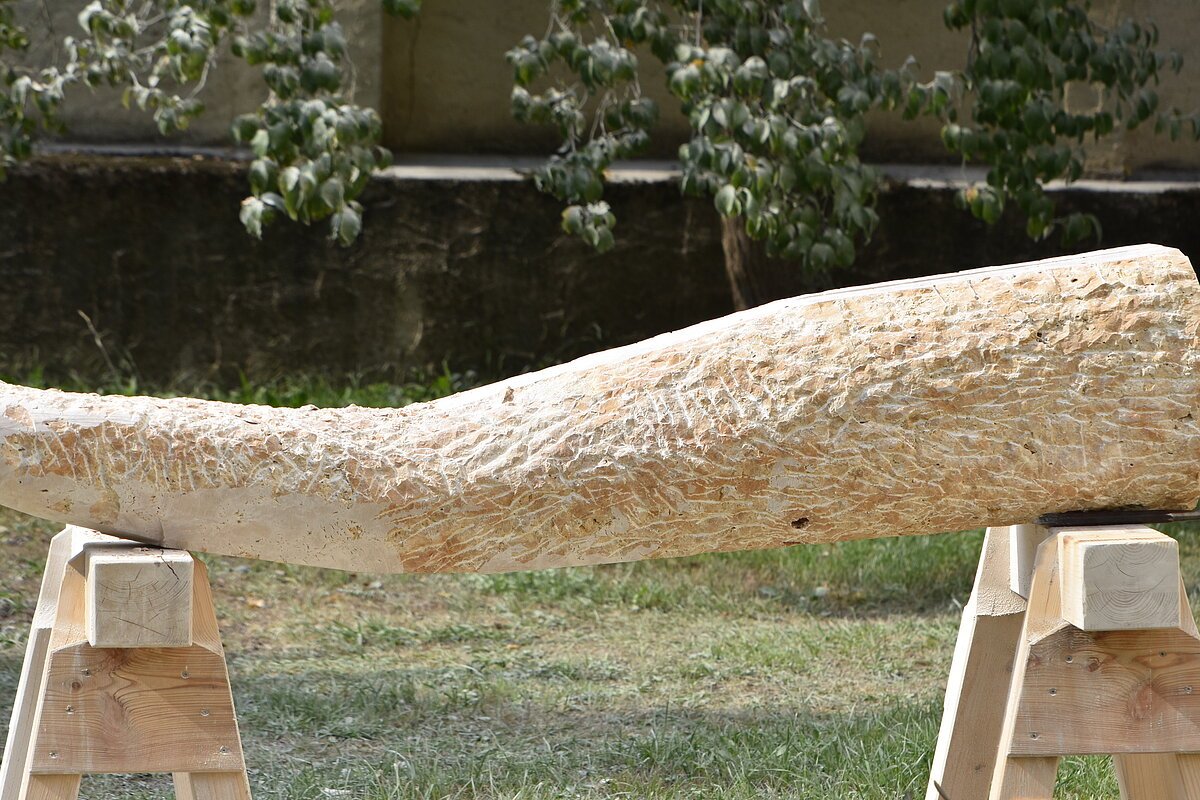Die Inspiration lag in einer Höhle Nähe Essing. Ein kleines Stück Elfenbein wurde dort gefunden, darauf eingearbeitet eine Ritzzeichnung, die ein Mammut darstellt. Die Begeisterung für dieses Geschöpf war so groß gewesen, dass dieser Urmensch es festhalten musste. Dies wurde bildhauerisch so ausdruckstarken und archaischen umgesetzt, dass mich die Arbeit überzeugte diese Skulptur zu schaffen. Die abgebrochene Fläche der Steinskulptur steht für das Fragment aus Elfenbein, welches man in der Höhle fand. Das Objekt stellt einen stilisierten Stoßzahn da, auf dem meine Interpretation der Ritzzeichnung sich über die Steinfläche zieht. Das Neue entstand aus dem Ursprung, wenn das Alte nicht stattgefunden hätte, würde das JETZT nicht existieren.